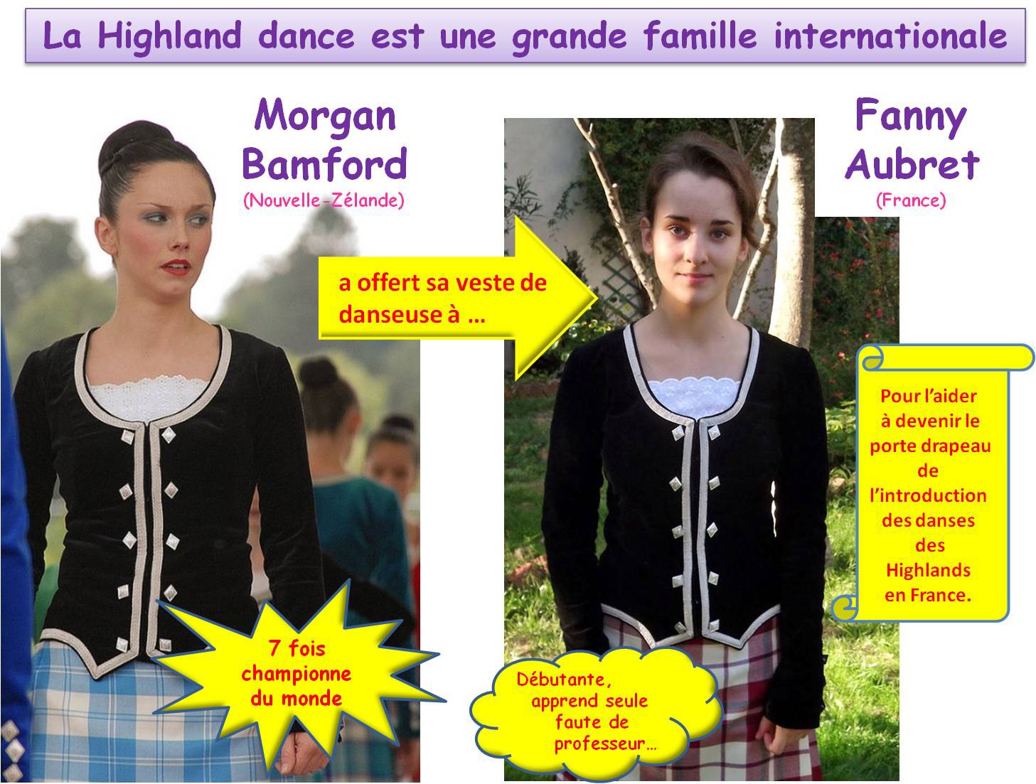 Morgan Bamford, 7 fois championne du monde, offre à Fanny Aubret sa veste de danseuse pour en faire le porte-drapeau des Highland dance en France.
