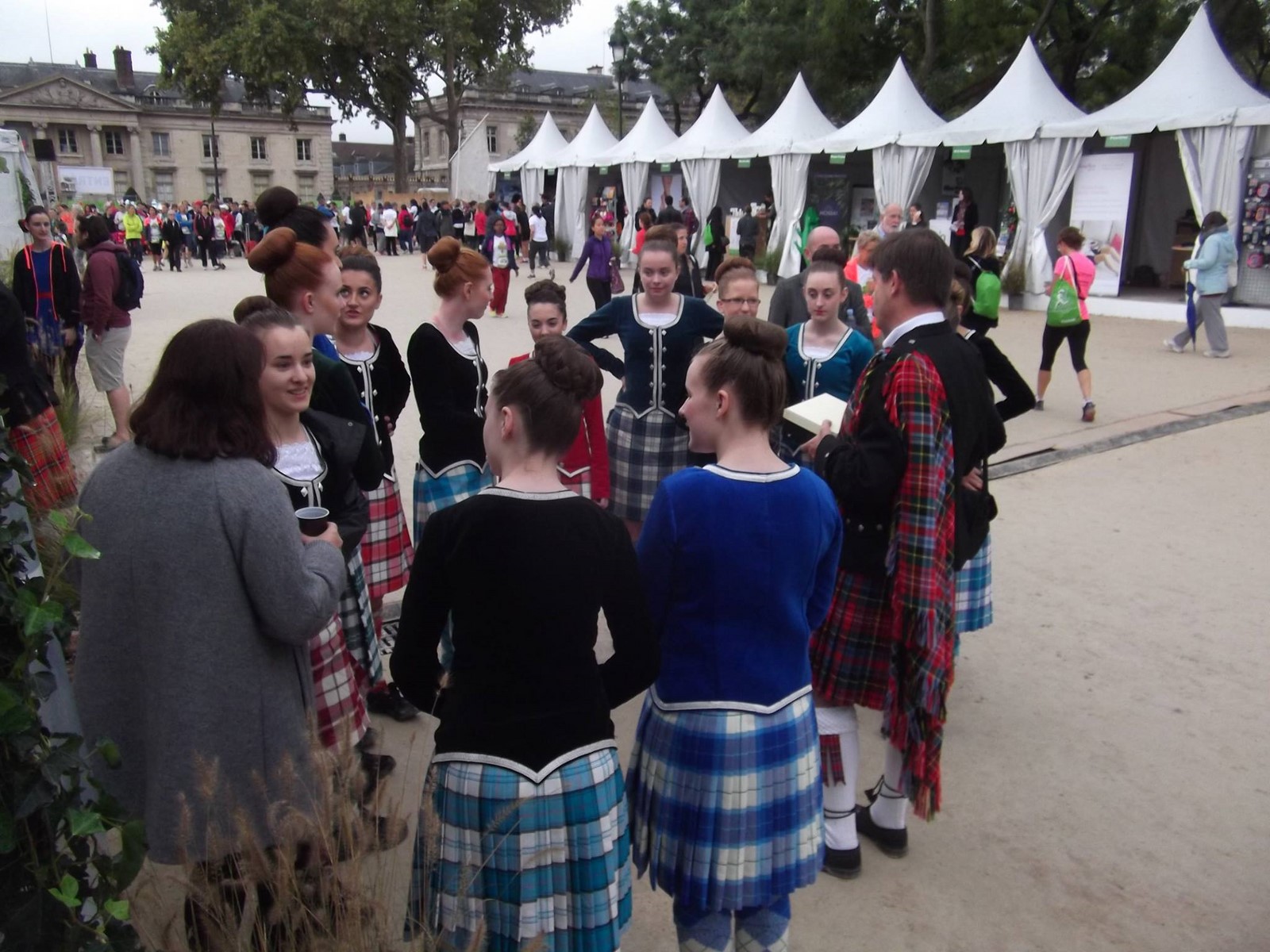 Stéphane Béguinot supervise la Highland dance lors de La Parisienne en compagnie de Fanny Aubret et de la Sarah Hendry school