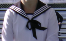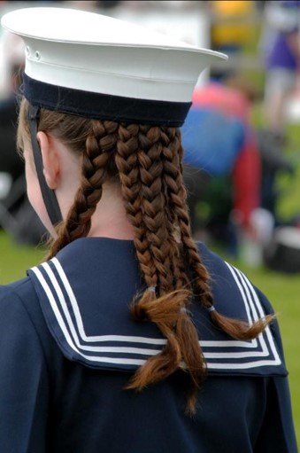 - Vareuse : bleu marine ou blanc, ajusté au corps, avec col en V fermé par 2 rubans. Le bas des manches doit coïncider avec celui de la vareuse.